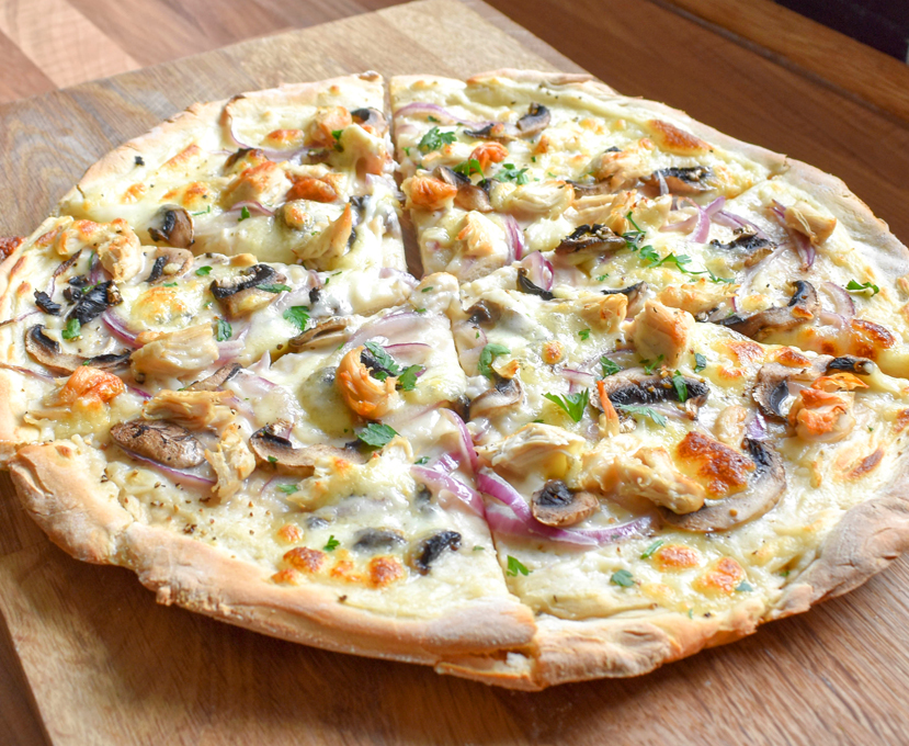 This one's a throwback classic. Whenever we bring this pizza onto our menu you guys go wild, white base with creamy mushrooms, red onion and torn chicken. You call it 'delicious', we call it Pollo con Funghi.